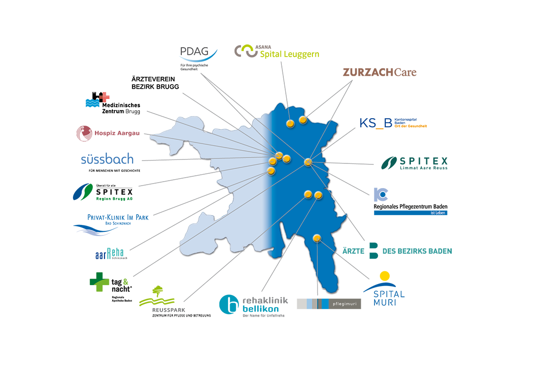 Das Gesundheits-Netz Aargau Ost GNAO steht für echte integrierte Versorgung: Mit Informationsaustausch, schnellen Rücksprachen und kurzen Wegen sorgt das Kooperationsnetzwerk dafür, dass nur das abgeklärt wird, was wirklich nötig ist. Das spart Kosten und Wartezeiten – doch vor allem sichert es der Bevölkerung im Ostaargau eine gezielte, individuelle, sichere und rationelle Versorgung. Klicken Sie auf das Logo einer der Institutionen, um mehr über ihre Kooperationen mit den GNAO-Partnern und ihre Rolle im GNAO zu erfahren.